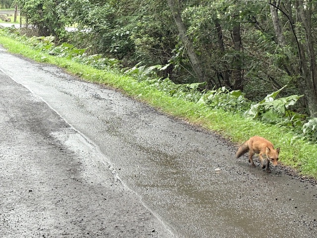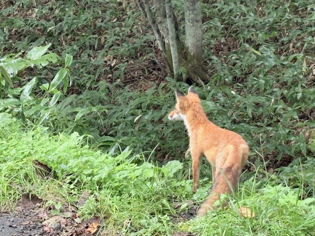 細岡展望台からさらに森の中を歩くことができるのですが、小雨がちらついてきたので引き返してビジターズラウンジに向かっているとキタキツネが歩いてました!