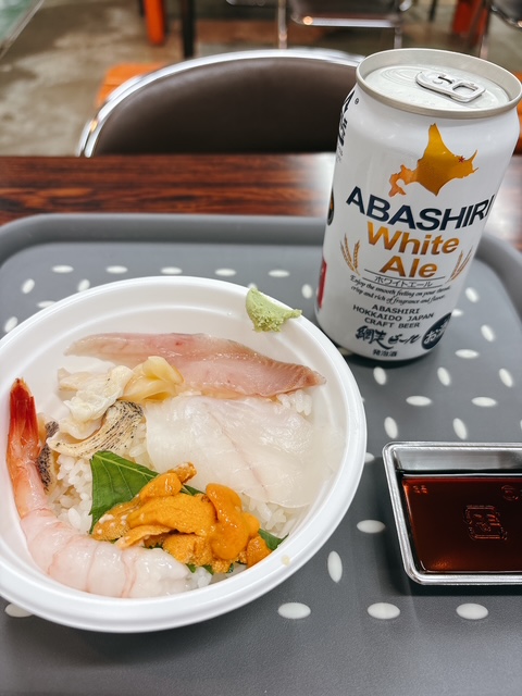 釧路に戻って和商市場で。ご飯を買ってお魚屋さんで好きなお刺身を乗せてもらう「勝手丼」です。