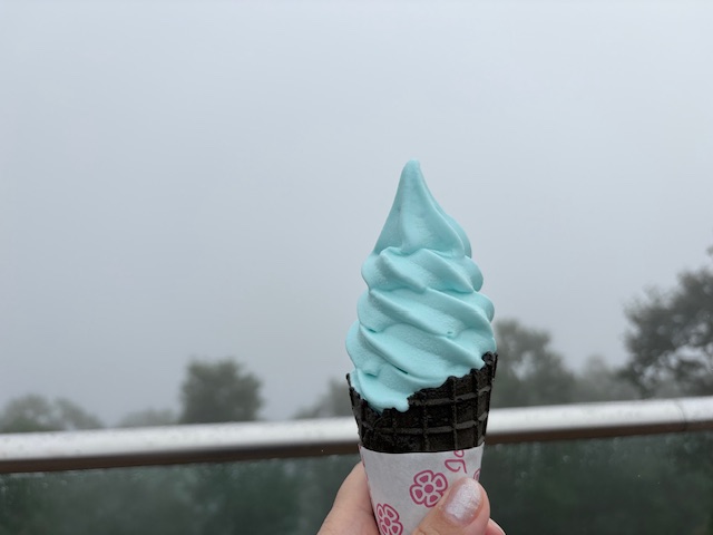 摩周湖ソフトを食べました。霧が晴れたらこんなきれいな摩周湖ブルーの湖が見えたのでしょうね。