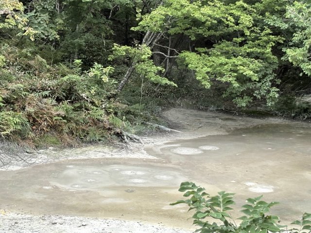 100℃ほどの熱せられた泥が地下から火山ガスとともにボコボコと音をたて絶えず噴出しています。泥は盛り上がり、そこに熱泥が積み重なり異様な灰色の光景を作り出します。地熱があるため雪が積もっても溶けてしまい積もることはなく地下の生命力を感じる事ができる場所です。
