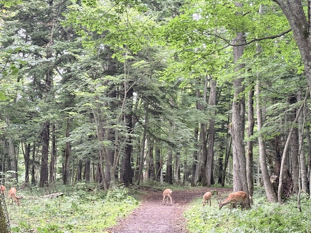 阿寒湖畔エコミュージアムセンター(この日は休館日でした。残念!)の横から森の中の道を歩いていくのですが、入り口にはエゾシカがたくさんいてちょっと怖い。